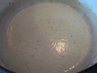 For the filling: heat the olive oil in a large skillet or dutch oven (LOVE my Lodge pot!). Cook the leeks until slightly soft, about 3 minutes. Add the carrots, mushrooms, potato, garlic, thyme, salt and pepper and cook till tender, about 12 minutes. At this point, my chicken breasts were done cooking in the over, so I poured the juices from the pan into the vegetables, chunked up the chicken and added it to the vegetables, too. I dumped all of this into a bowl, so I could reuse the same pan to make the sauce, which was great because it picked up all the browned bits from the bottom of the pan.