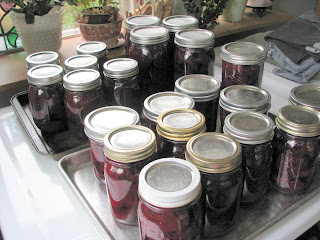 Suzanne’s neighbor, Bernie the Saint, makes the most delicious pickled beets on the planet. I was so excited to grow beets in my garden this year so I could pickle my own using Bernie’s recipe, but alas, there weren’t enough beets ready to be harvested at the same time, so I had to buy most of them.  My friend, Karlene, and I have been canning fools lately.  We made strawberry jam, raspberry jam, and just last week, pickled beets. Its so much more fun to can with a friend! When we were making the strawberry jam, I said, “Hey, I smell smoke.  The neighbors must be burning brush.” But then we noticed a wooden spoon had worked its way onto the burner and was smouldering.  We got a good laugh out of that.  But anyways, back to the beets…here is the recipe for the most delicious pickled beets you will ever eat: