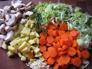 For the filling:  heat the olive oil in a large skillet or dutch oven (LOVE my Lodge pot!). Cook the leeks until slightly soft, about 3 minutes.  Add the carrots, mushrooms, potato, garlic, thyme, salt and pepper and cook till tender, about 12 minutes. At this point, my chicken breasts were done cooking in the over, so I poured the juices from the pan into the vegetables, chunked up the chicken and added it to the vegetables, too. I dumped all of this into a bowl, so I could reuse the same pan to make the sauce, which was great because it picked up all the browned bits from the bottom of the pan.