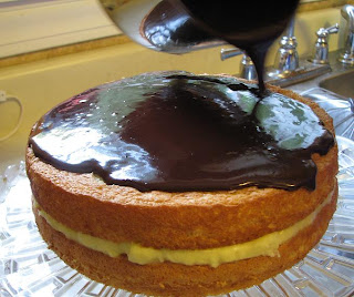 Assembly:  place one cake layer on a plate or cake stand.  Spoon pastry cream over cake and spread  to cake edge.  Place the second layer on top.  Pour glaze over middle of top layer and let flow down the sides.  Let sit until glaze fully sets, about 1 hour..