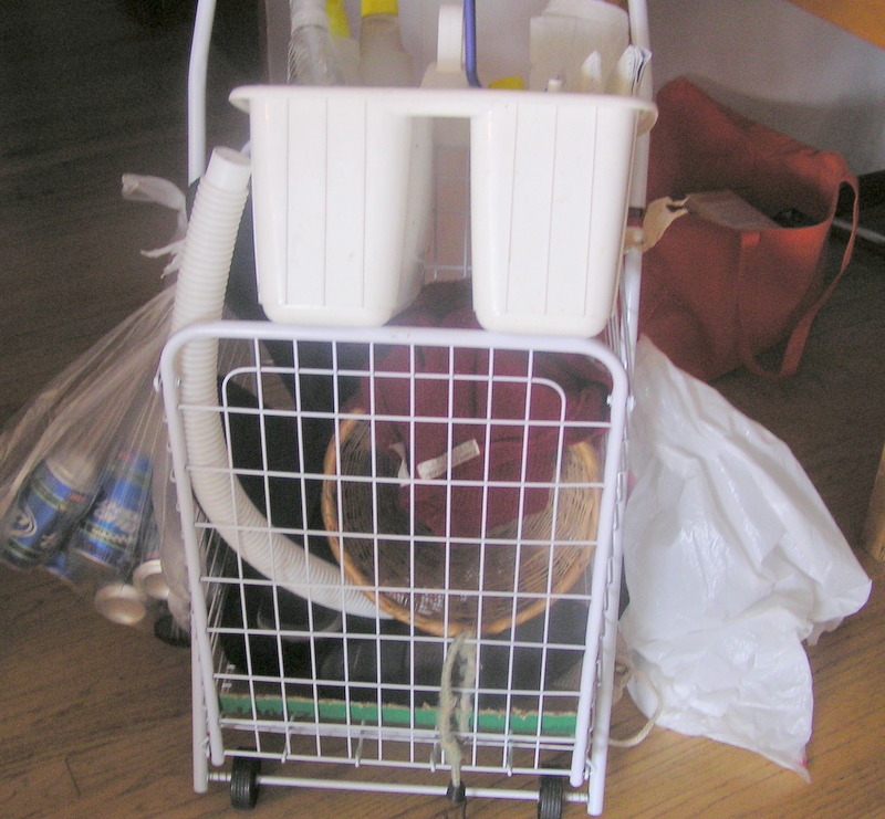 So, I came up with this nifty cart idea. It’s just a simple cart on wheels that folds flat. I got the idea while watching maid service at a hotel. They never have to run off to put something away or pick something up. Everything they need is right there with them.