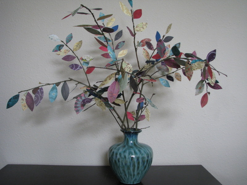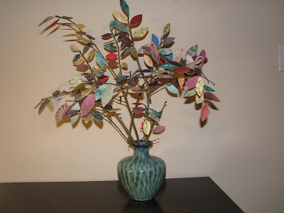 (See how the floral wire made it look like the leaf had a vein right down the middle, just like in nature).  Fill up your branches with your leaves till you like how it looks.  Here’s how mine turned out….I love it!