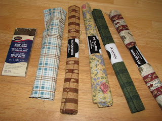So off to Jo-Ann Fabrics I went with my 40% off coupon in hand.  I picked out these 5 fabrics in the “fat quarters” section and a package of extra wide double fold bias tape in olive.  I paid $7.73 for everything after coupons.
