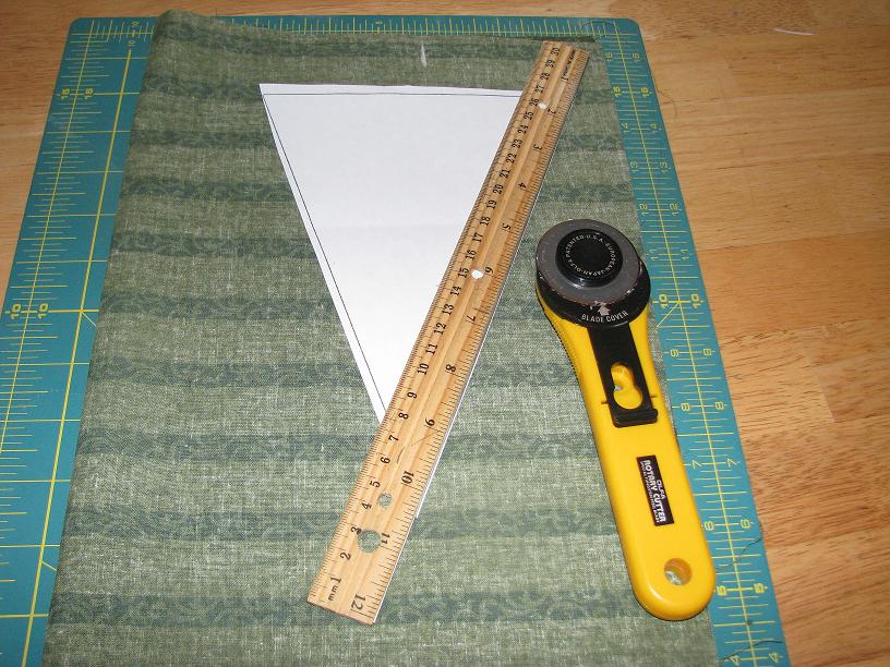I cut a triangle out of a piece of paper approximately 6″ wide and 8″ long to use as a template.  I ironed each piece of fabric, then folded it in half, right sides together, and ironed it again.  I used a cutting mat, rotary cutter, ruler and triangle template to cut out each triangle. I didn’t use any pins or draw any lines, I just winged it.