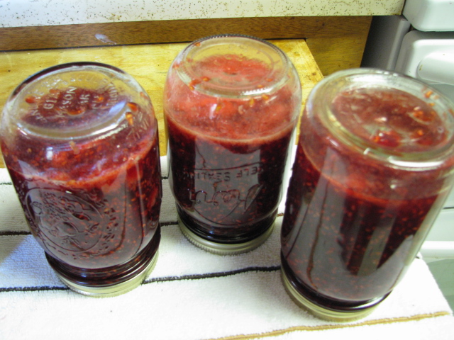 For the blackberry jam and raspberry jam we both had frozen berries; we each picked berries right out of our yards ~ we had tons of blackberries and Suzanne had beautiful raspberries this year. We followed the instructions inside the SureJell package to make cooked jam which was basically to crush the fruit (which we do by hand or you can use a potato masher) and put in a large pot, mix in one box of SureJell and let come to a full rolling boil. Next, add the sugar (which is a lot, but remember you only use a small amount on a PB&J or toast) and let that come to a full rolling boil. Pour the hot jam into the prepared jars and seal. We used the processing method where after the hot jam is poured into the jars and sealed, you simply turn the jars upside down for 10 minutes, then turn right side up again.