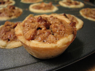 Filling: Beat together the egg, sugar, 1T. butter, vanilla and salt until smooth. Divide the nuts evenly into the cups (oops, I accidentally threw them into the filling, so I stirred it all up and then filled each cup). Spoon filling into cups.