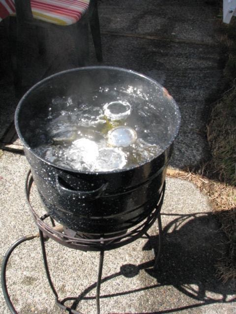 1) Wash jars, lids and rings in hot soapy water. After washing, we simmer the lids and rings in hot water until ready to use.