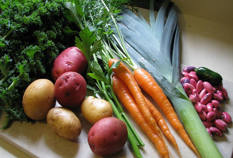 Grab a soup pot and put in about 2T. of olive oil. Heat on medium-high heat. While the oil is heating, in a pie plate, put 1-1/2C. flour, seasoning salt and lots of black pepper. Coat each piece of meat in the flour, then brown it in the olive oil on all sides. Remove from the pan and set aside. Add a little more oil to the pan if needed and add the leek and jalapeno and saute till tender, about 2 minutes. Add 3 minced garlic cloves to the leeks and cook another minute. Dump the leeks, jalapeno and garlic on top of the browned meat you have sitting to the side. Now add the celery, carrots, and potatoes to the pan, and saute for about 10 minutes to get them slightly browned. To the veggies, add 6 cups of beef broth and stir to pick up all the golden deliciousness on the bottom of the pan, then add a can of diced tomatoes, 3 T. tomato paste, 3 bay leaves, the meat, leeks and garlic, 2C. of torn up kale and 1-1/2C. frozen peas. I also added a handful of fresh beans that I shelled. I used scarlet runner beans and when cooked, they had a lima bean thing going on, which nobody cared for but me. Anyways, turn the heat down and let everything simmer. The longer it simmers, the better. Serve with some freshly grated Parmesan cheese on top and some crusty french bread.